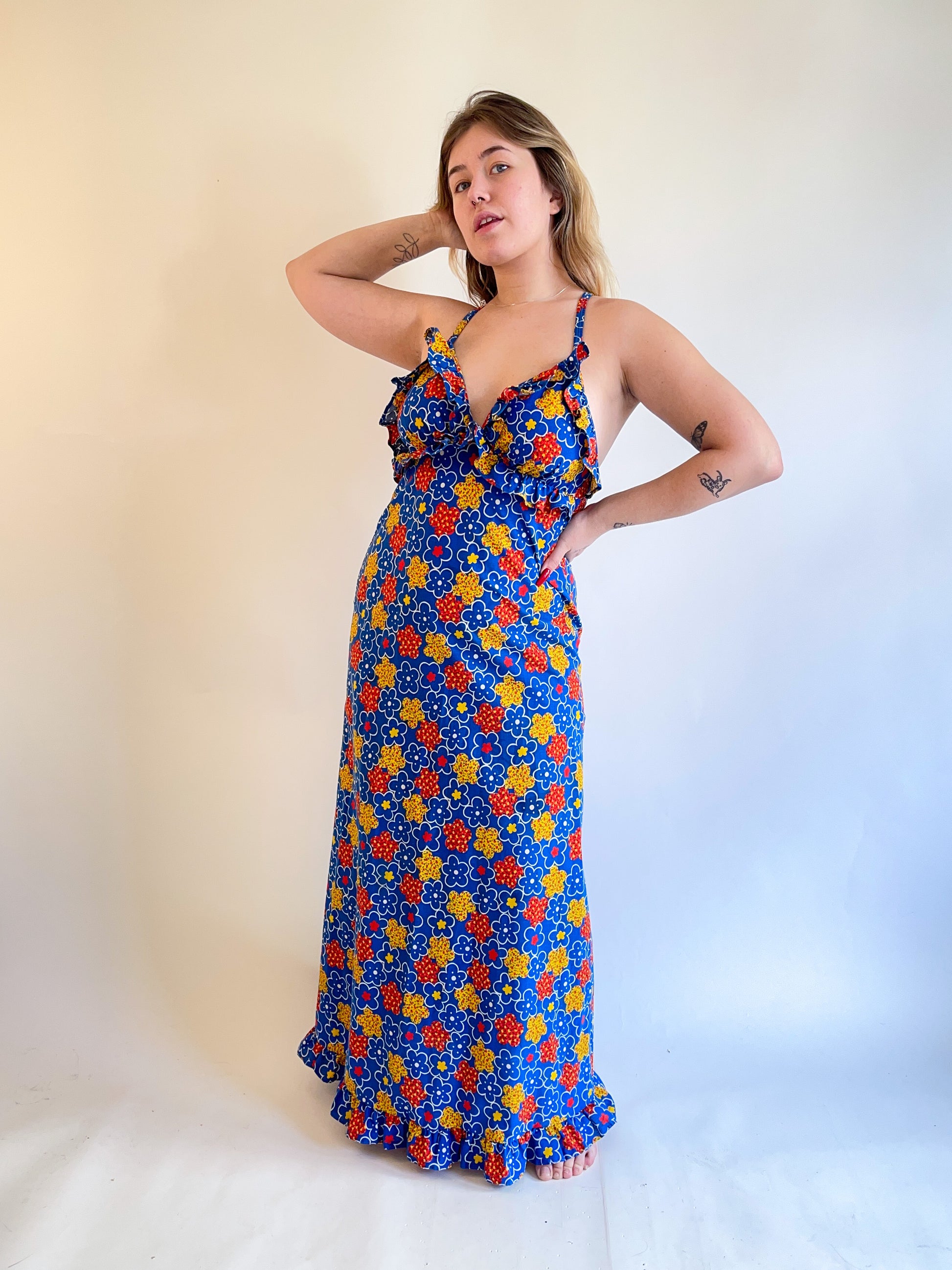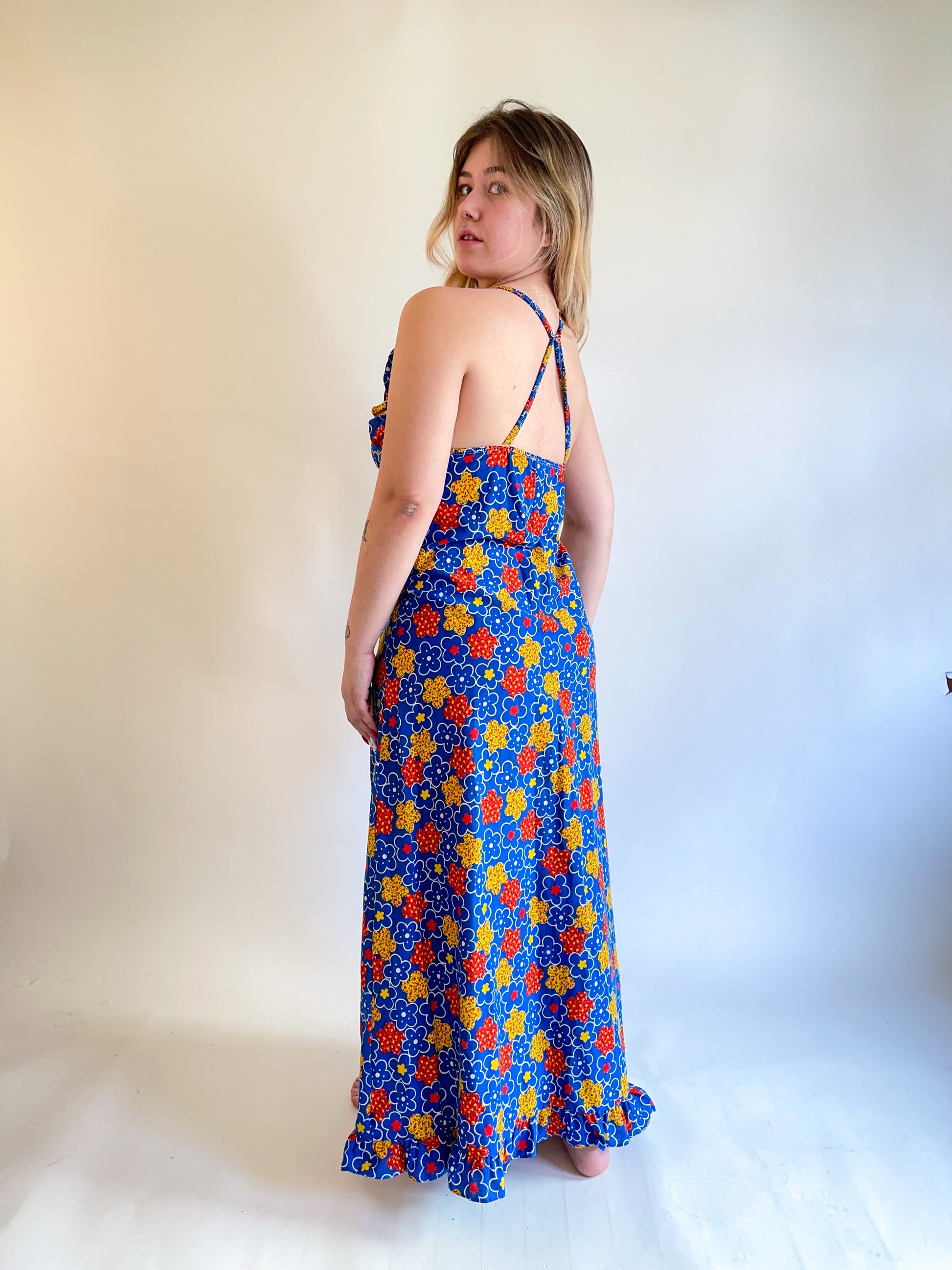 70s ABC Flower Print Maxi Dress (M)