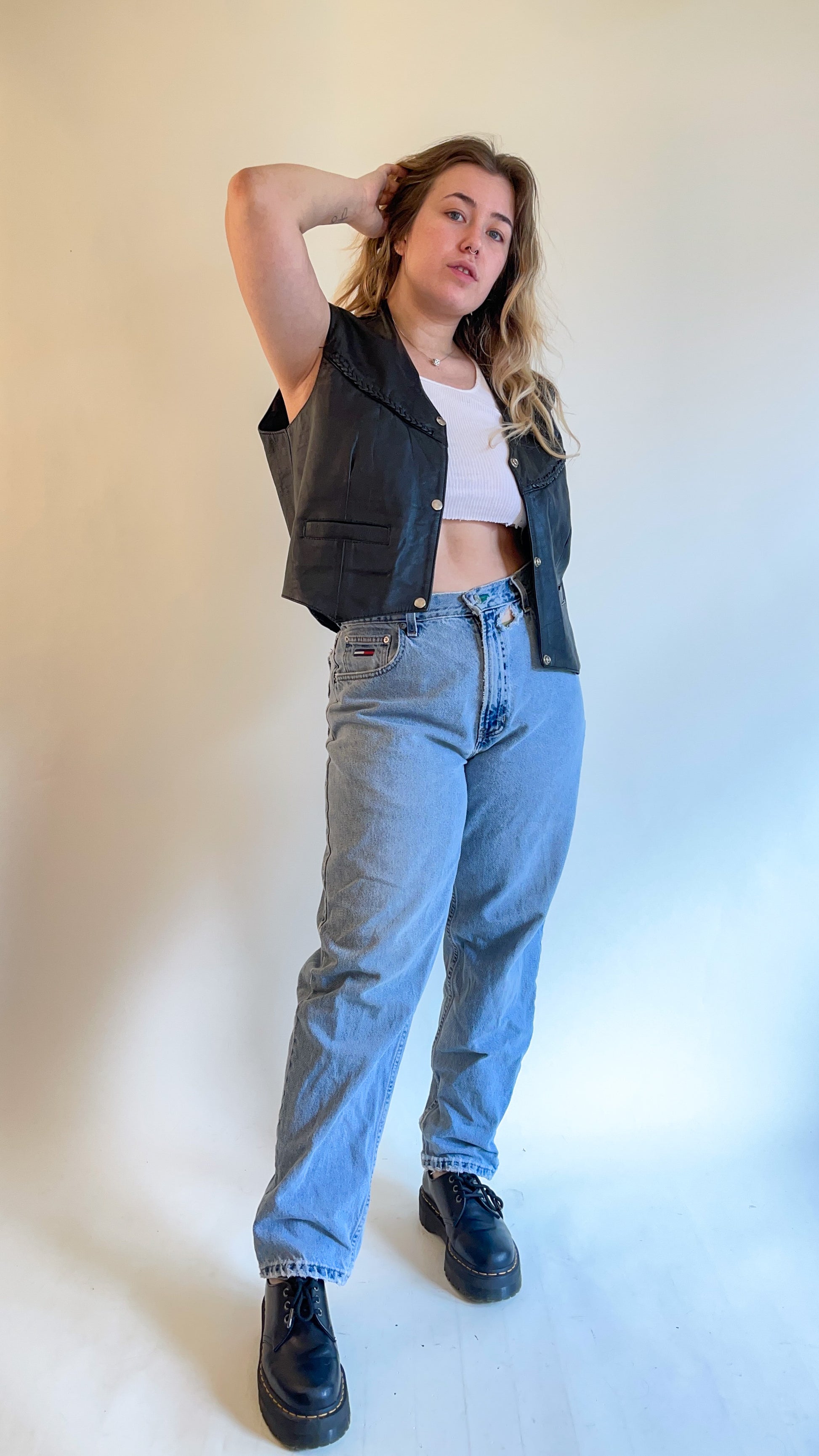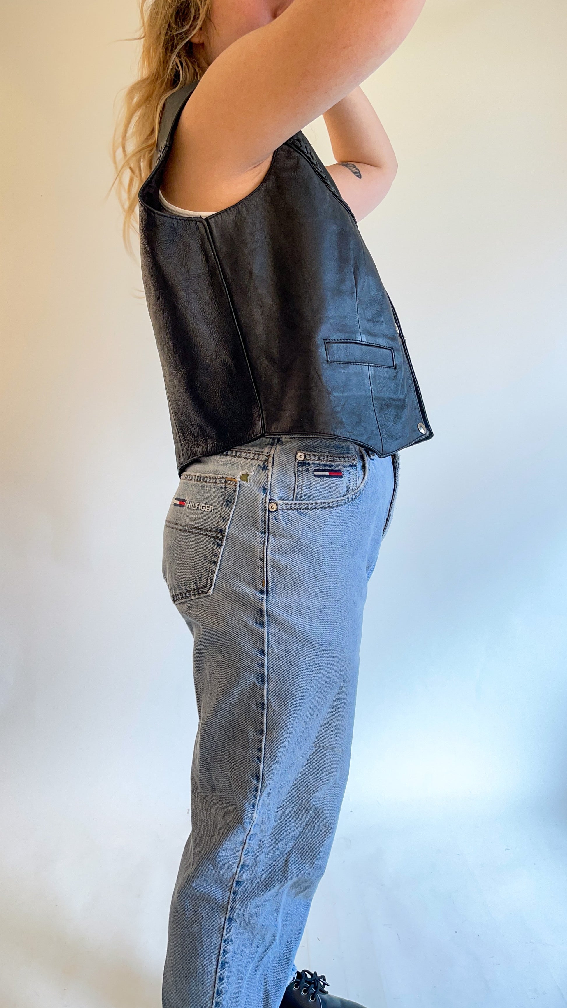 80s Black Leather Vest w/ Braided Detail (XL)