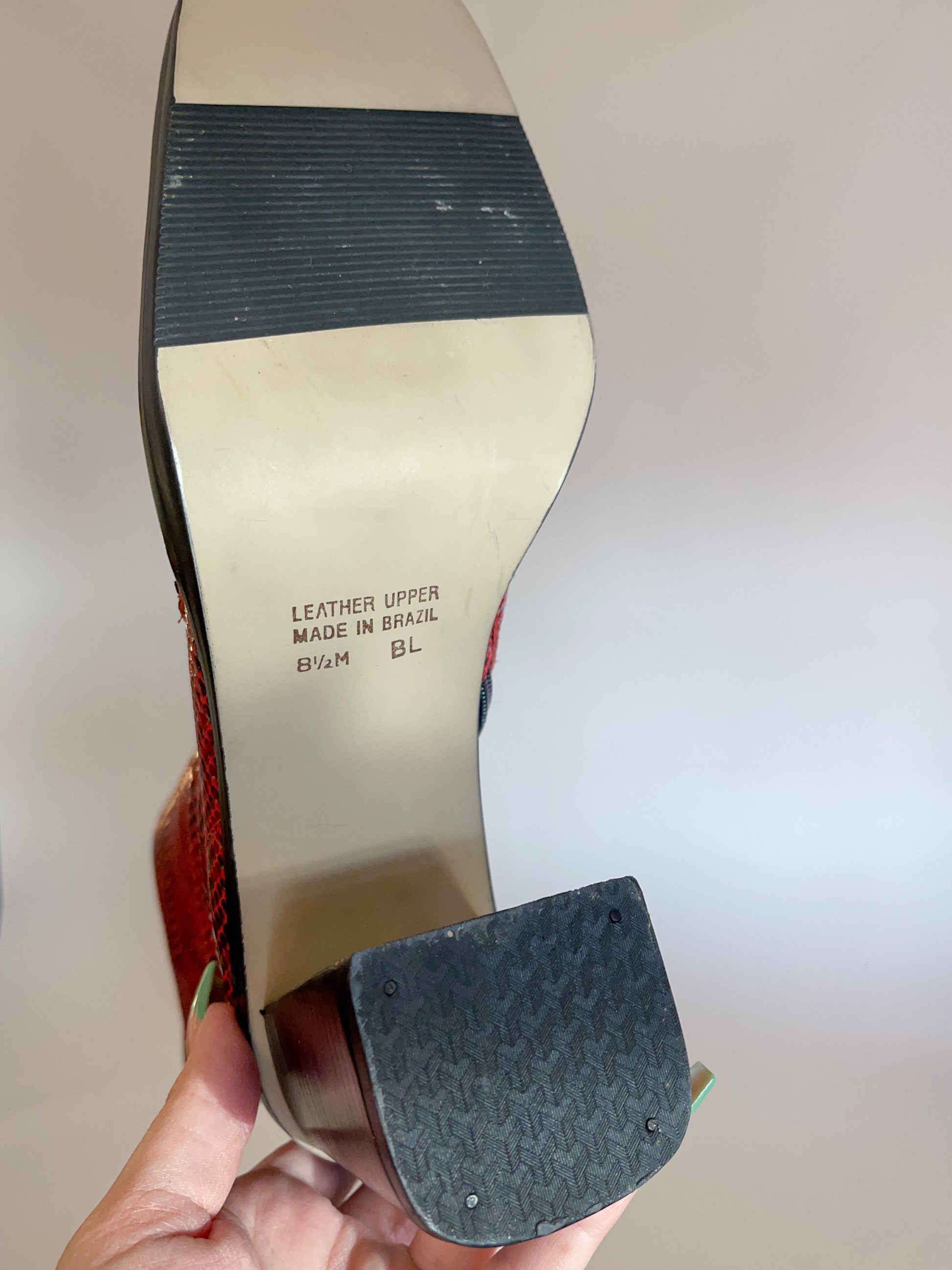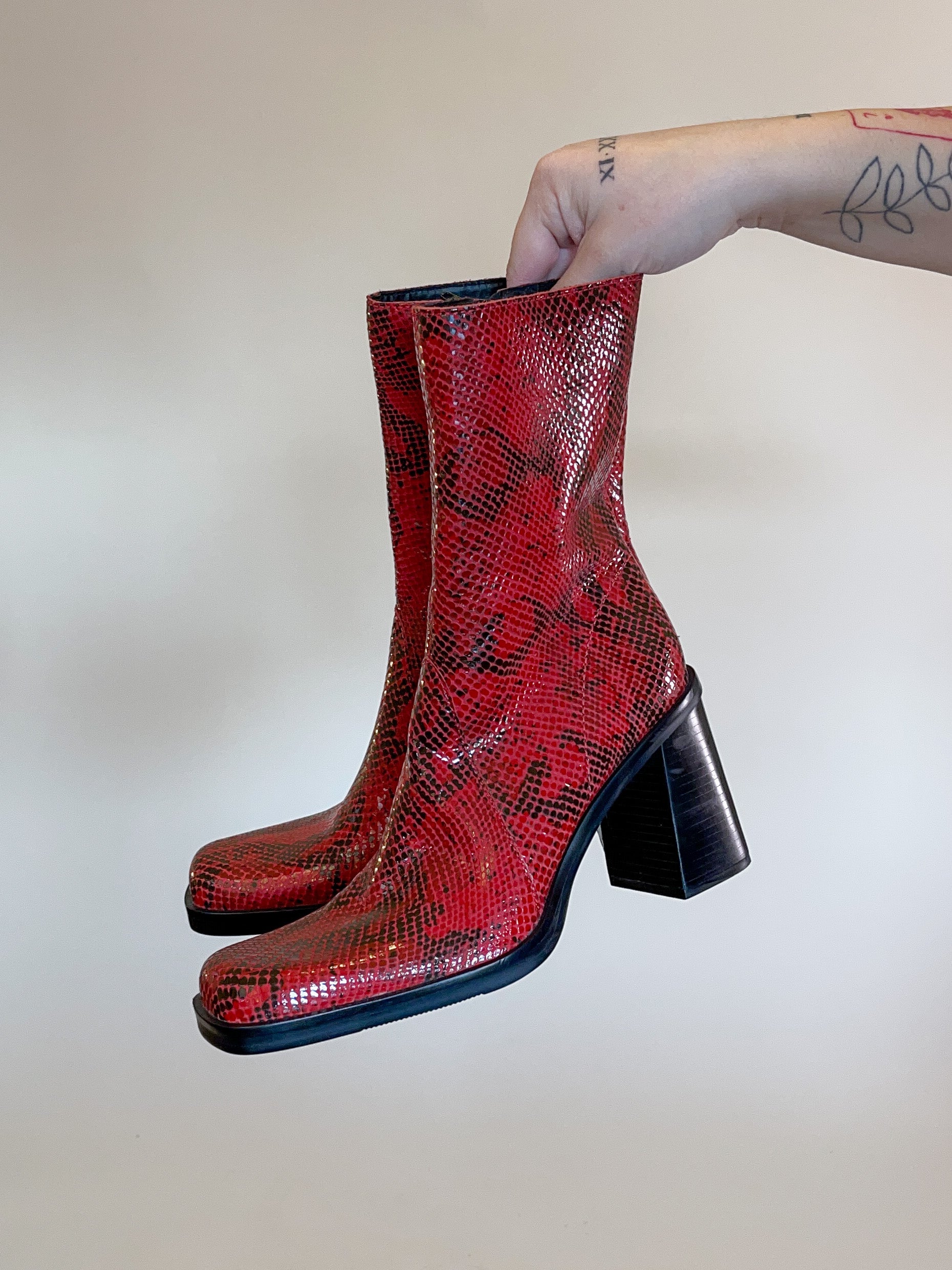 Vintage 1990s red snakeskin square toe boots with a chunky heel